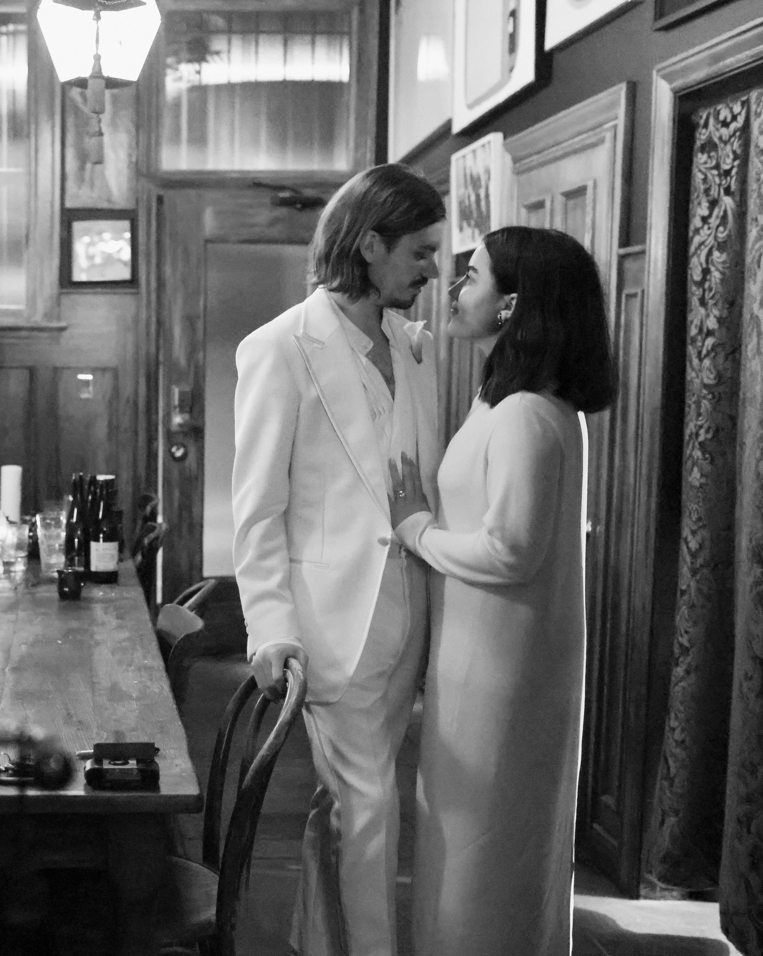 Black and white photo of a man and woman standing close, touching foreheads, inside a cozy restaurant or bar with wood-paneled walls and framed pictures. The man has shoulder-length hair, dressed in a light-colored suit, and the woman has dark, shoul
