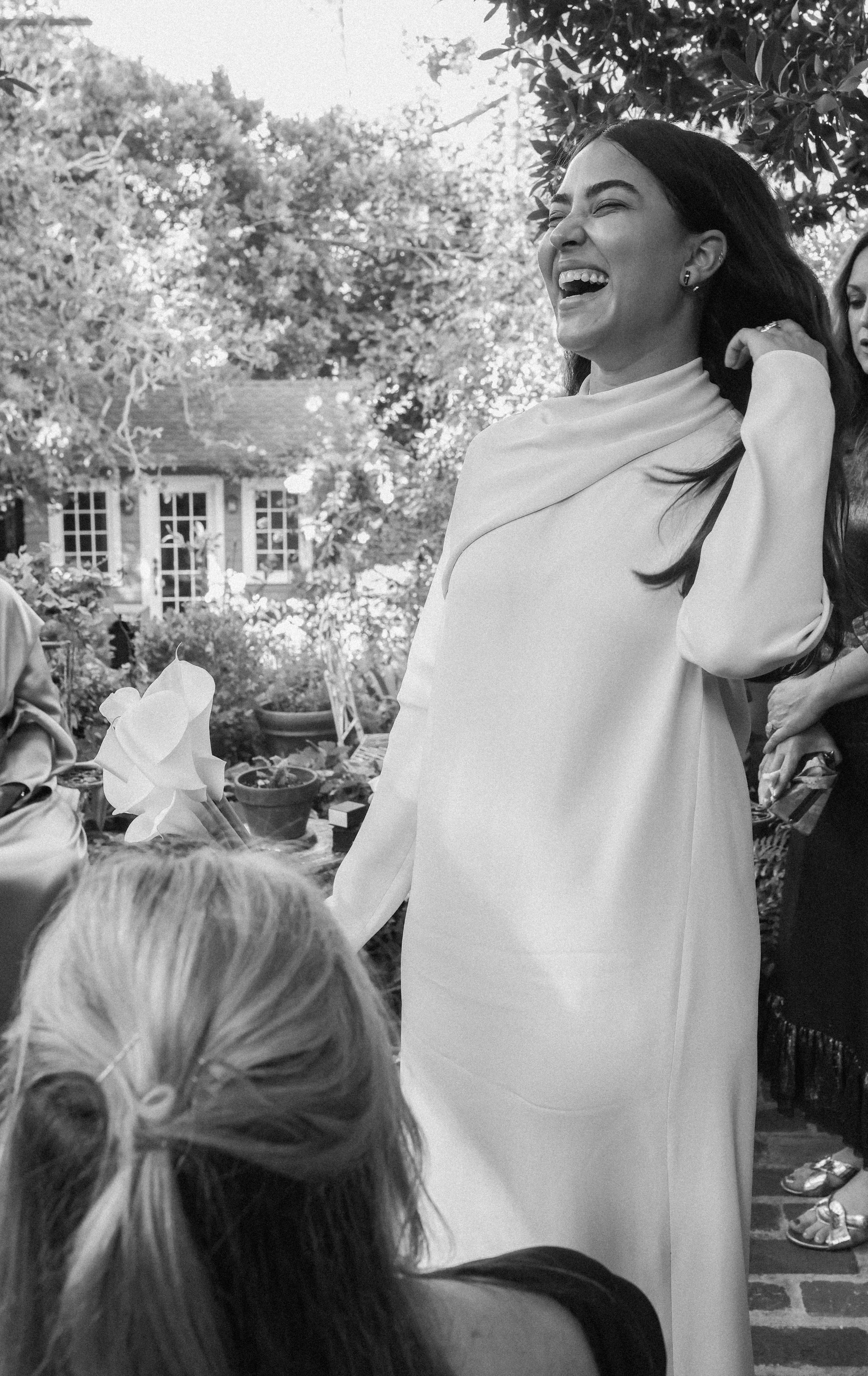 A woman in a white dress laughing outdoors during a social gathering, with people and plants in the background.