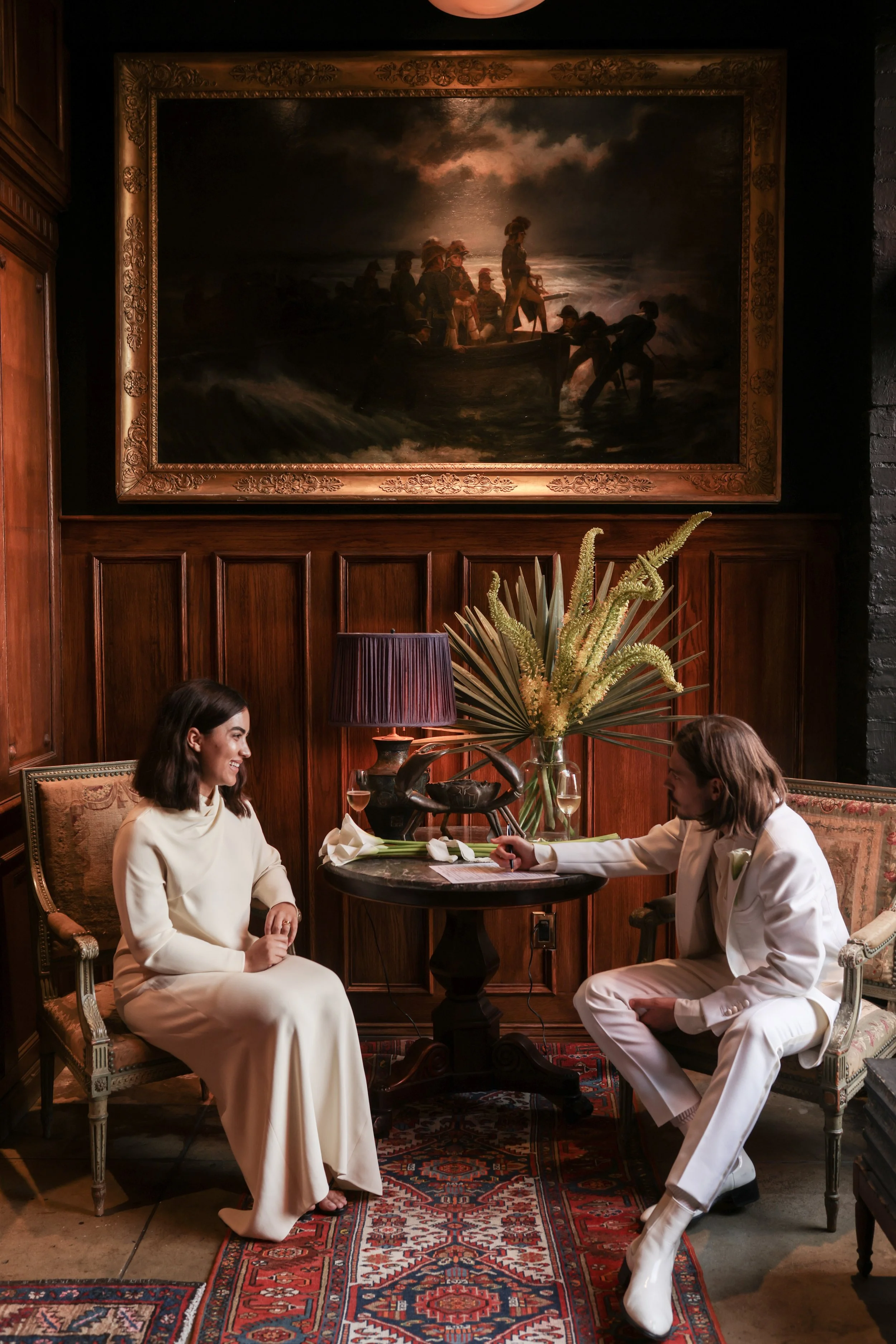 A man and woman dressed in white sitting and talking in a warm, wood-paneled room with elegant furniture and a large floral arrangement on a table between them.
